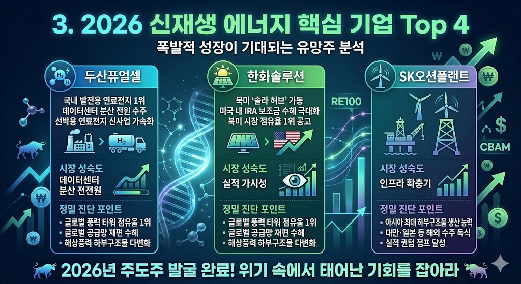 2026년 하반기 신재생 에너지 투자는 **'실적 장세'**로 요약됩니다. 과거처럼 단순한 환경 보호 테마로 모든 종목이 오르던 시대는 끝났습니다.