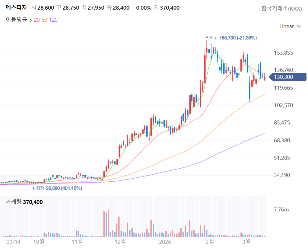 에스피지 130,300원 -21.36% 60일선 부근 지지 테스트 중