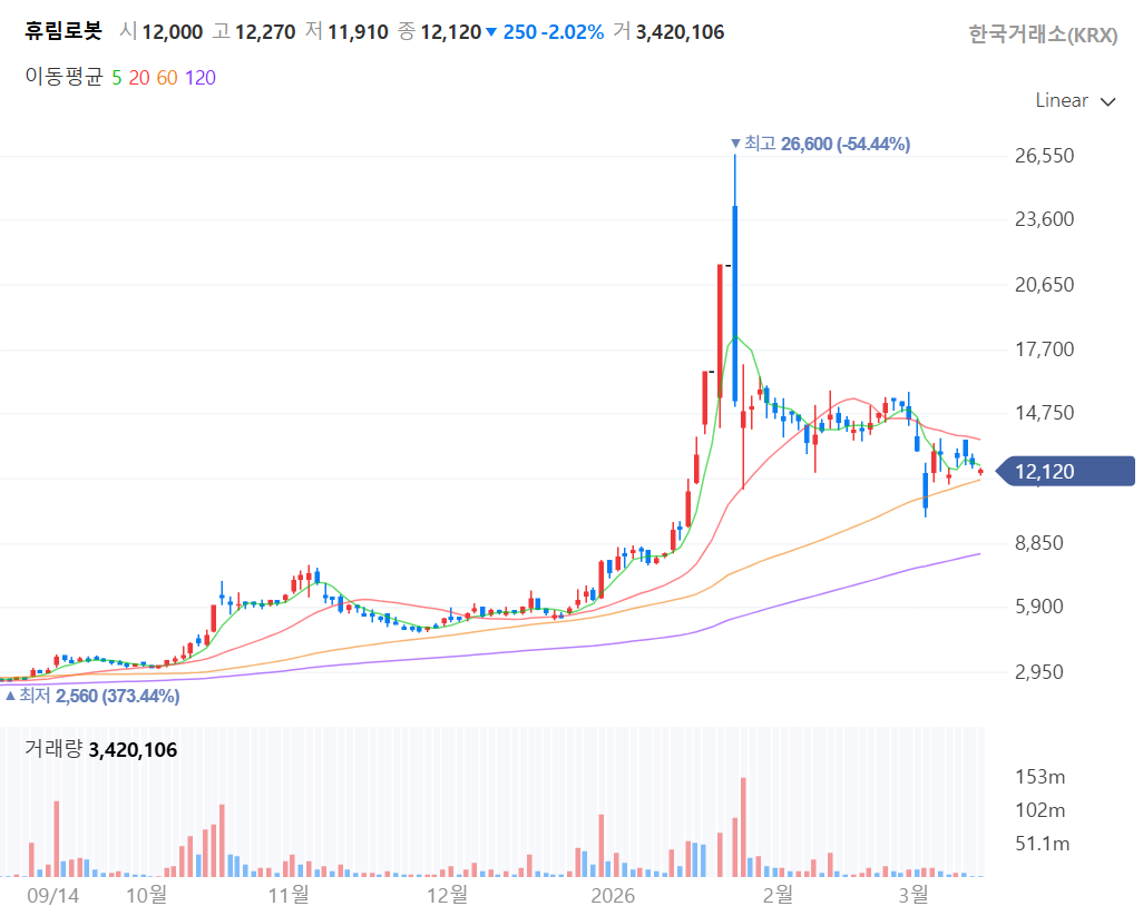 휴림로봇 12,120원 -54.44% 120일선(보라색) 최후의 보루