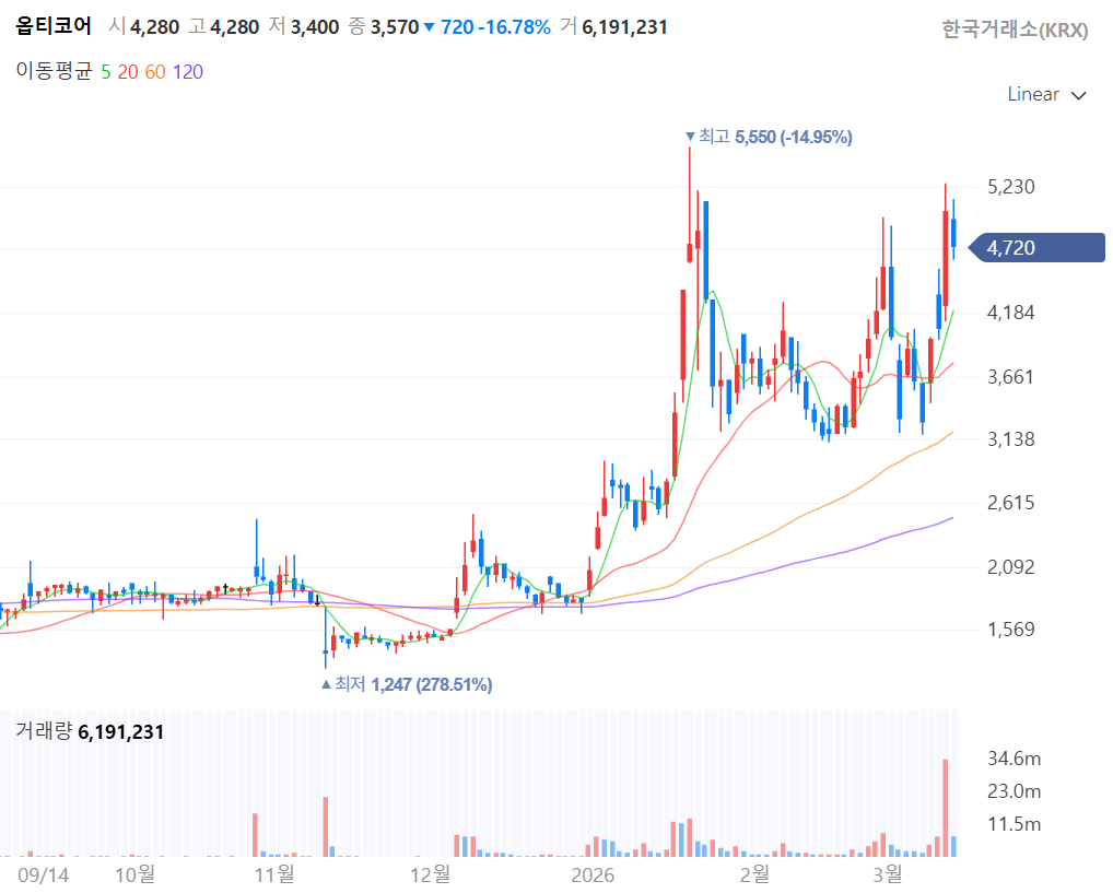 • 작년 말 1,247원 저점 이후 시작된 우상향 흐름이 매우 가파릅니다. 최근 5,550원 고점 기록 후 3,300원대까지 급락하며 지지선을 테스트했으나, 다시 4,720원까지 빠르게 회복하며 전고점 탈환을 노리는 '역헤드앤숄더' 혹은 'N자형' 상승 패턴을 보이고 있습니다.