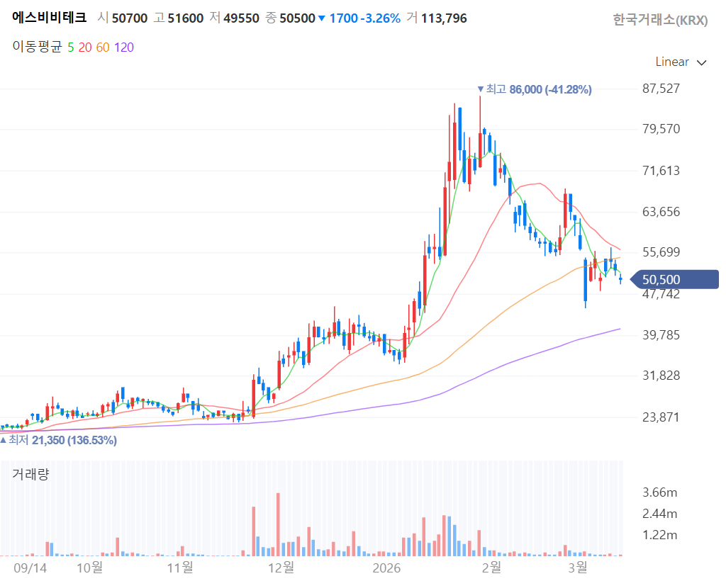 에스비비테크 50,500원 -41.28% 20일선 아래, 매물 부담 존재