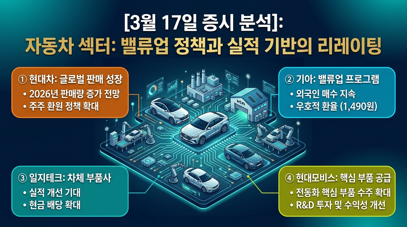 자동차 섹터는 저평가 매력과 우호적인 환율 환경(1,490원대)을 바탕으로 안정적인 상승세를 유지했습니다.