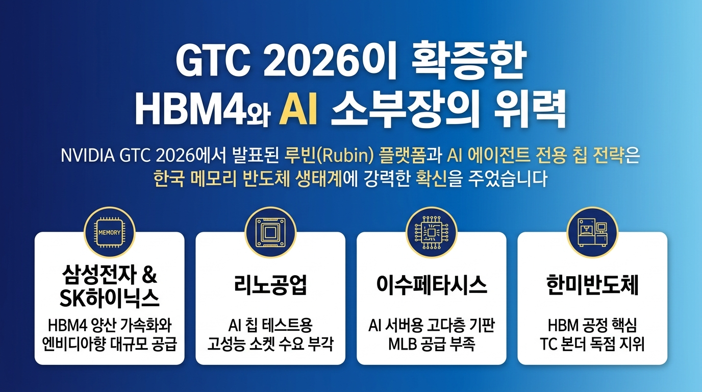 NVIDIA GTC 2026에서 발표된 '루빈(Rubin)' 플랫폼과 AI 에이전트 전용 칩 전략은 한국 메모리 반도체 생태계에 강력한 확신을 주었습니다.