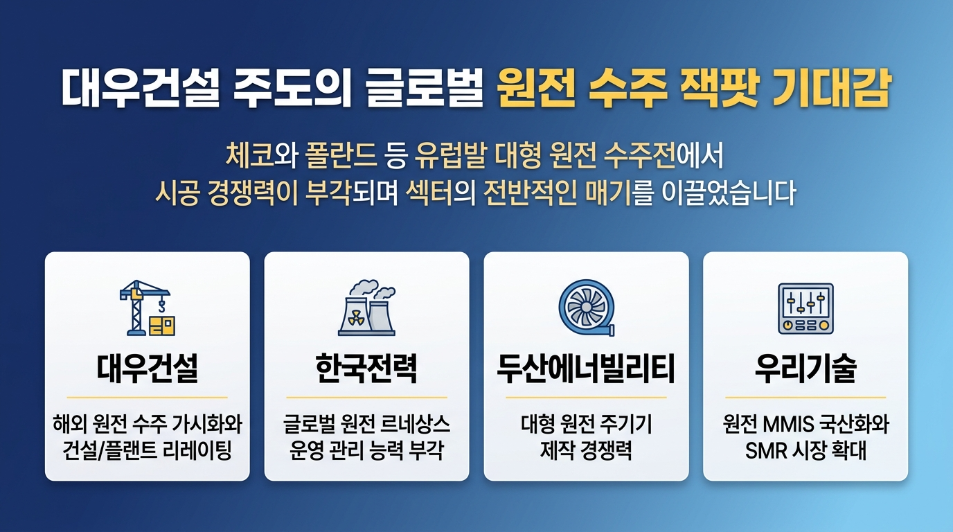 | 원전 | 대우건설, 한국전력, 두산에너빌리티, 우리기술 | 글로벌 수주 / SMR | 체코 원전 시공권 확보 기대감 및 SMR 상용화 |