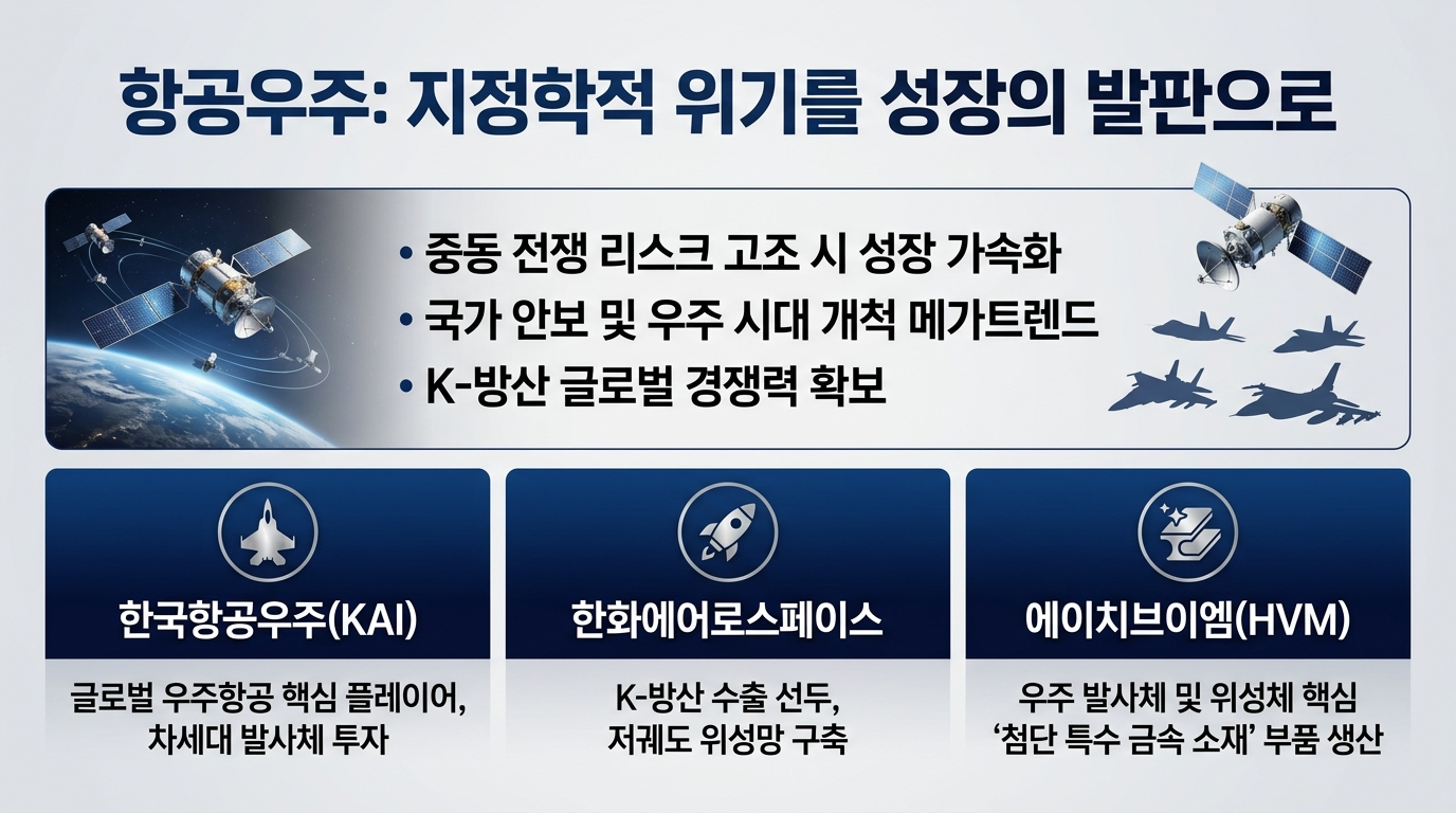 항공우주 및 방산 섹터는 중동 전쟁 리스크가 고조될수록 오히려 시장의 주도권을 쥐게 되는 구조적 성격을 지니고 있습니다. 국가 안보와 우주 시대 개척이라는 거스를 수 없는 메가 트렌드에 탑승해 있습니다.