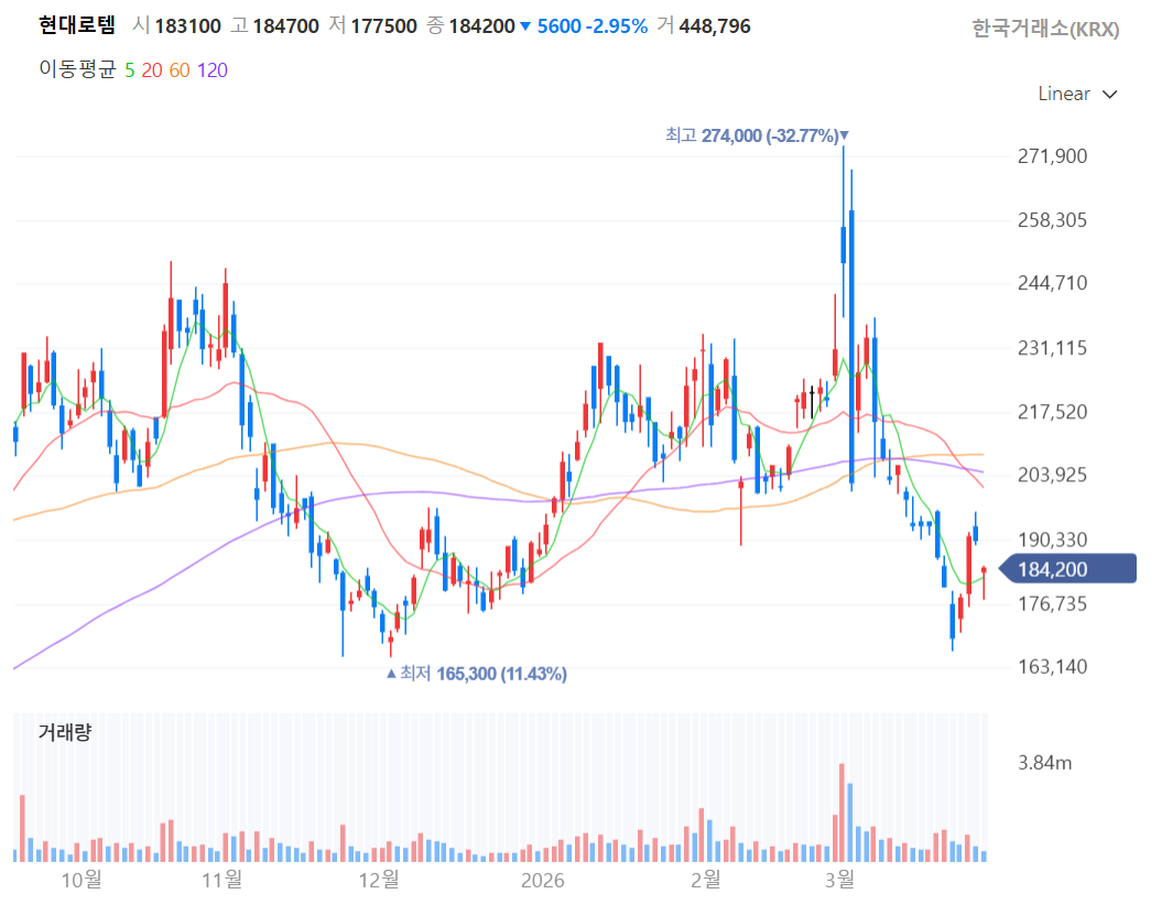 현대로템의 차트는 최근 급격한 상승과 조정을 겪은 역동적인 흐름을 보여줍니다. 2026년 초, 역사적 고점인 **274,000원(-32.77% 꼬리)**까지 치솟았던 주가는 이후 강한 차익 실현 매물에 밀려 현재 가격대까지 하락했습니다.