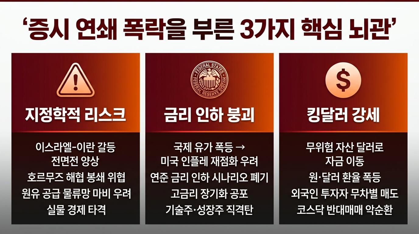 많은 분들이 단순히 '중동 전쟁 때문이겠지'라고 생각하시지만, 오늘 시장을 붕괴시킨 원인은 지정학적 리스크 하나만이 아닙니다. 중동발 악재가 글로벌 경제의 취약한 뇌관들을 연쇄적으로 폭발시킨 **'복합 시스템 쇼크'**로 보아야 합니다. 오늘 폭락의 진짜 이유를 다각도로 분석해 보고, 이런 극단적인 장세에서의 대처법과 내일 장 전망까지 짚어보겠습니다.
