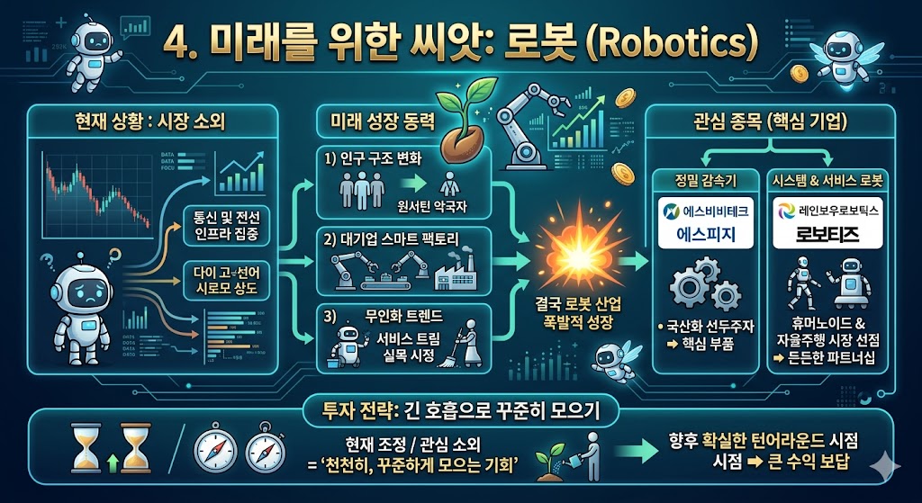 현재 증시 수급이 통신과 전선 인프라 쪽에 집중되며 로봇 섹터는 다소 소외되어 있습니다. 하지만 인구 구조 변화와 대기업들의 스마트 팩토리, 무인화 트렌드는 결국 로봇 산업의 폭발적인 성장으로 귀결됩니다.