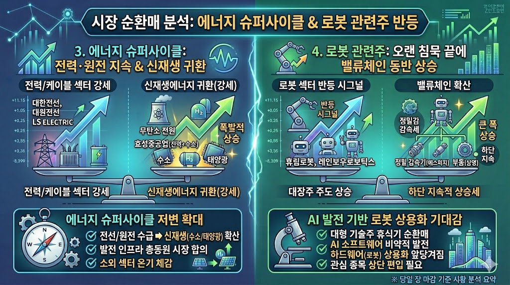 현재 시장은 특정 테마 하나가 독주하기보다는 반도체, 이차전지 소재, 에너지 인프라, 로봇 등 뚜렷한 실적 모멘텀을 가진 섹터들 사이에서 자금이 빠르게 도는 '순환매 장세'입니다.
